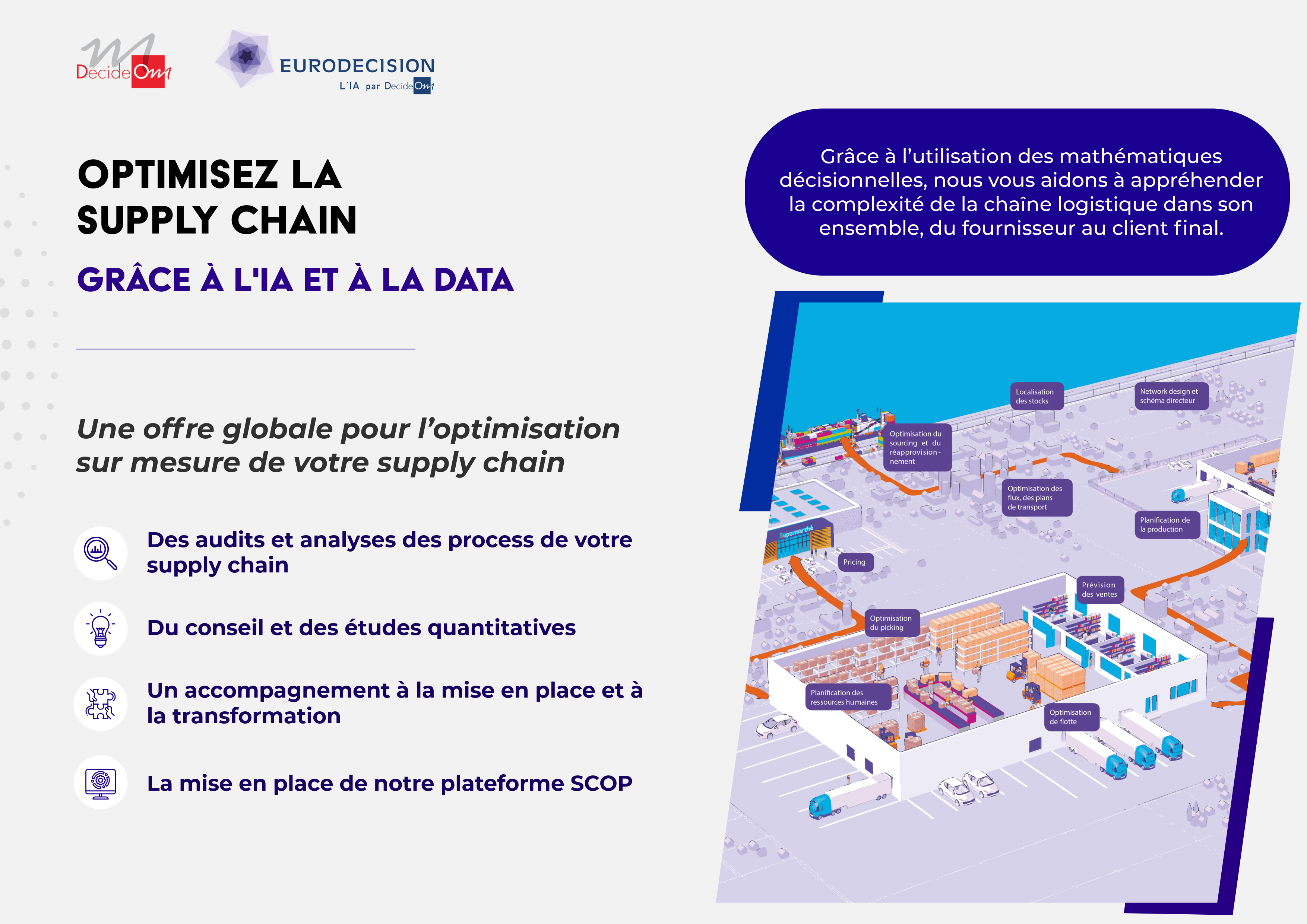 En alliant expertises Data et IA, DecideOm est le premier acteur français à proposer une offre complète en matière d’optimisation et d’aide à la décision, afin de fournir au client une plateforme data performante et gouvernée pour collecter, structurer, consommer, analyser les données et utiliser ce patrimoine de données pour apprendre, prévoir et développer des applications métiers optimisées par l’IA.