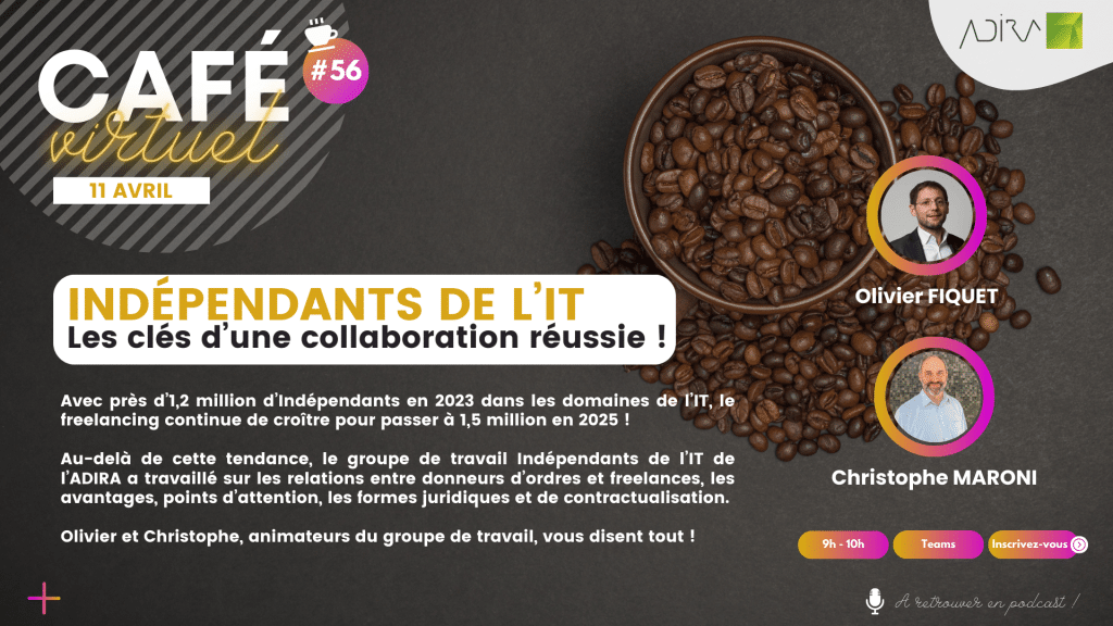 Au-delà de cette tendance, le groupe de travail Indépendants de l’IT de l’ADIRA a travaillé sur les relations entre donneurs d’ordres et freelances, les avantages, points d’attention, les formes juridiques et de contractualisation.